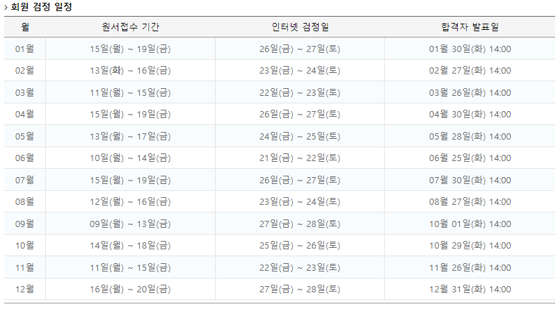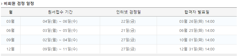 회원 검정 일정은 [달마다 1번씩] 있으며 비회원 검정 일정은 [3개월에 1번씩] 있으니 참고하셔서 신청하시기 바랍니다.